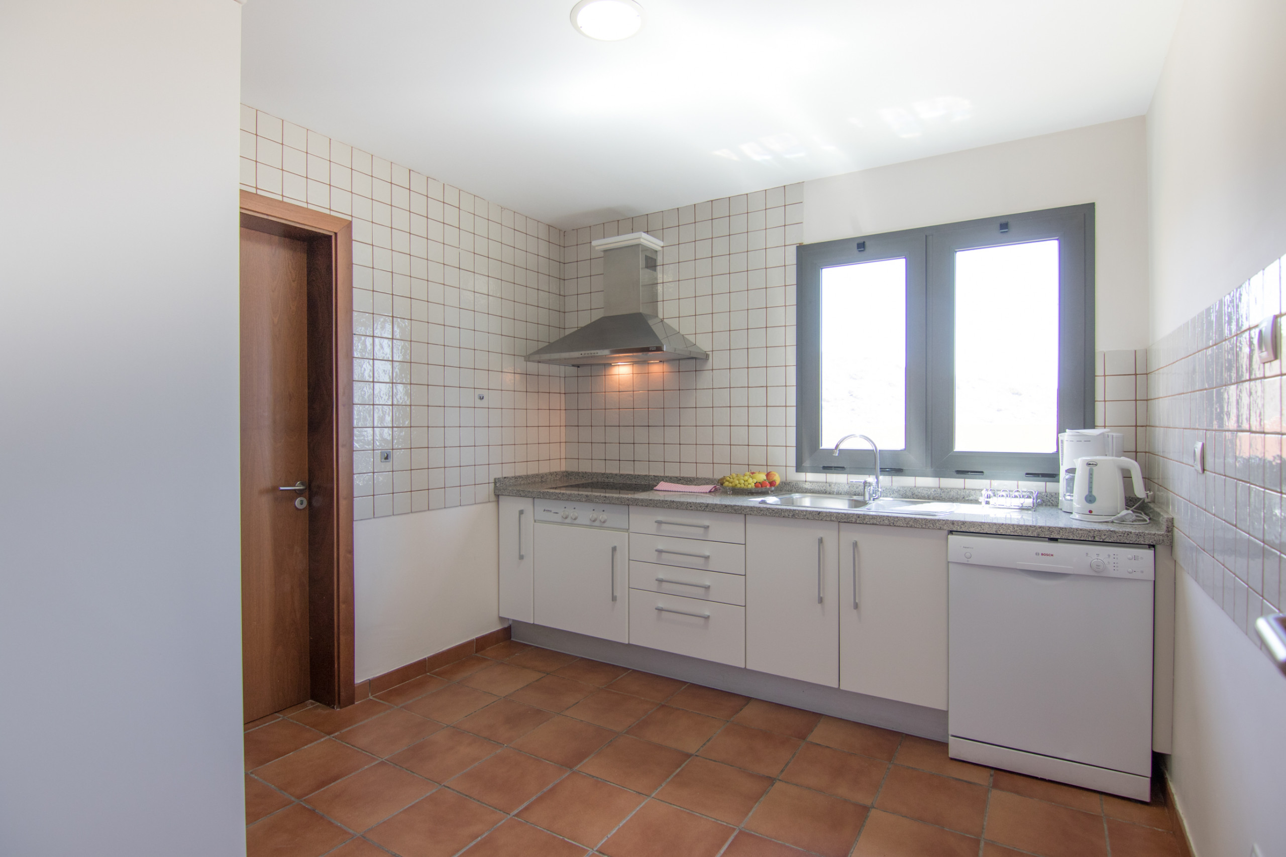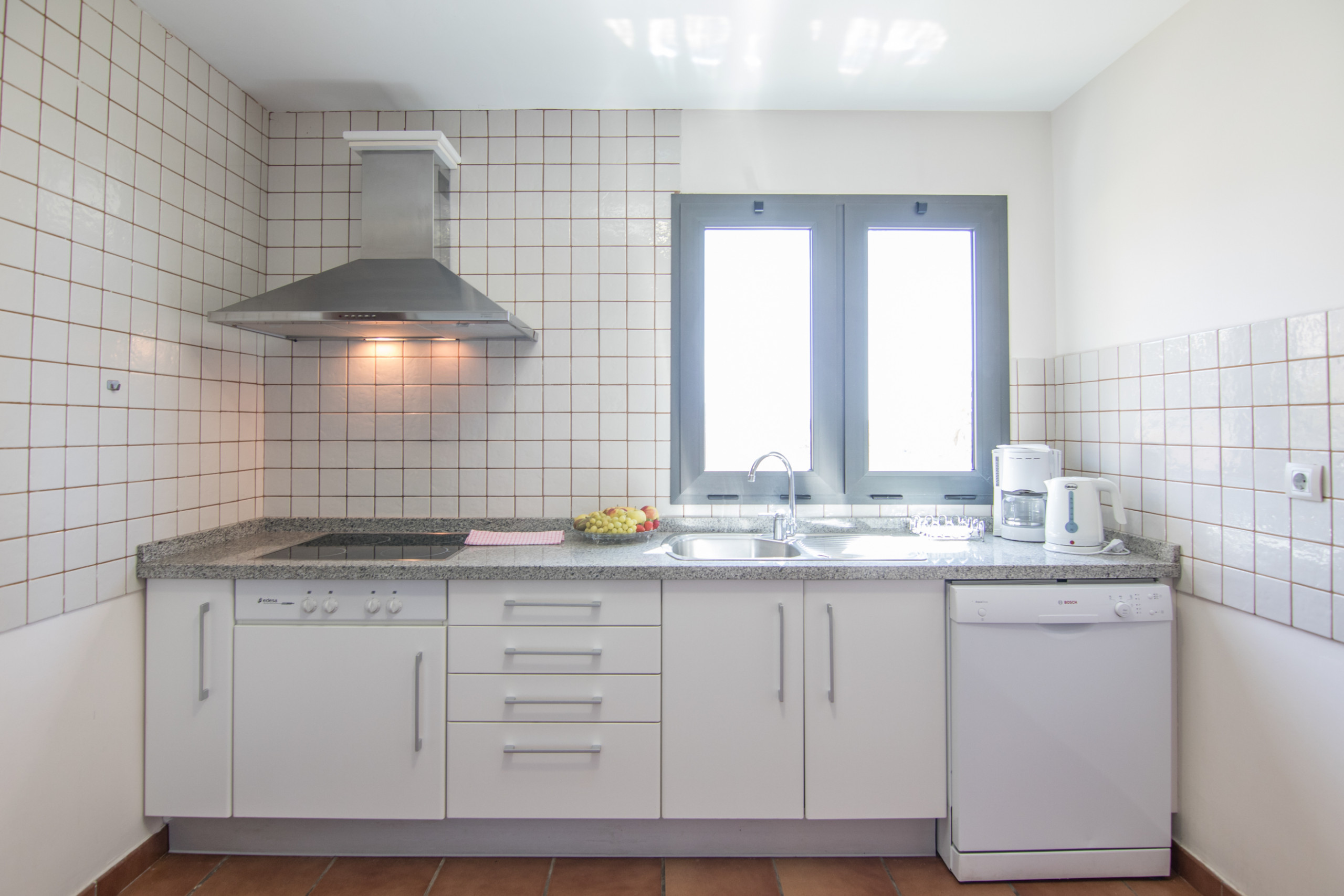 Cocina de inducción con nevera, microondas, horno, congelador, lavadora, lavavajillas, cafetera, tostadora, hervidor de agua, exprimidor y menaje completo.
